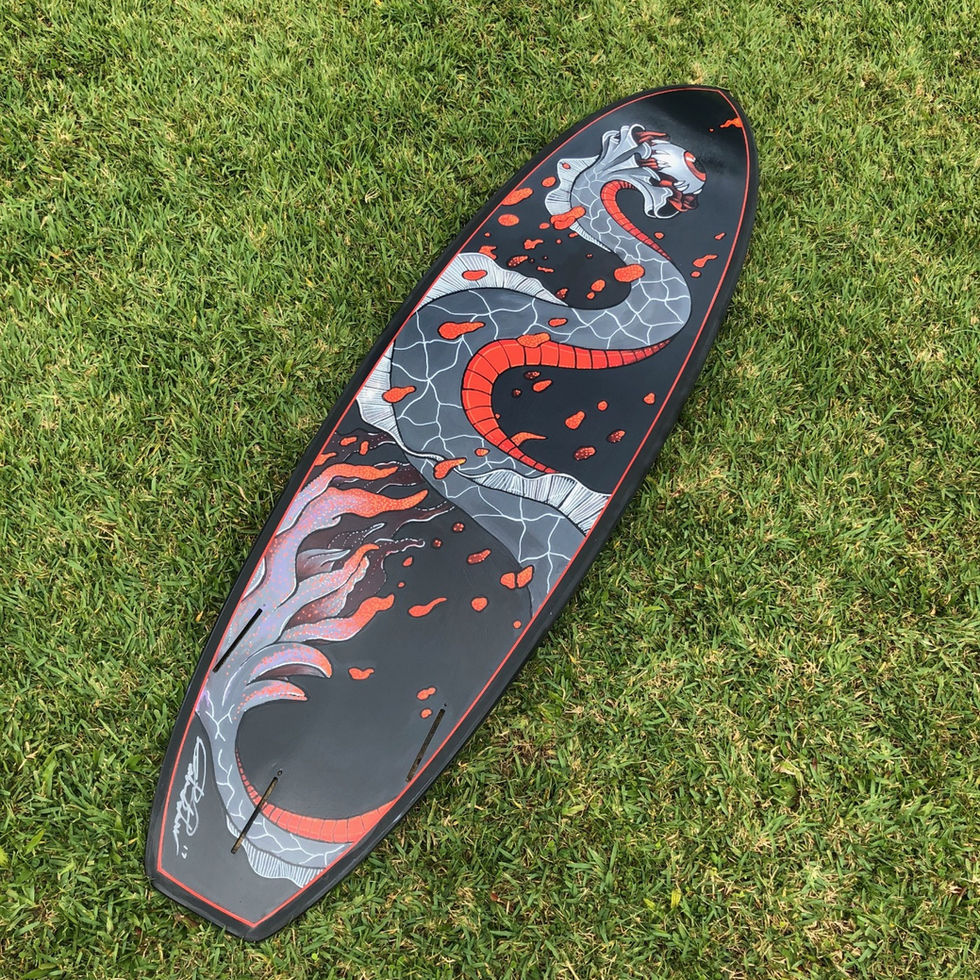 The artwork on the "Phillip" surfboard is nothing short of mesmerizing. The sea dragon, an all-seeing and all-knowing creature, is rendered with a dynamic and fierce presence. The dragon's sinuous body, painted in shades of grey and accented with fiery reds, coils across the board against a dark, ominous background. Fiery embers and flames seem to dance around the dragon, enhancing the sense of movement and danger. The dragon's head, with its intense, piercing eyes, dominates the top of the board, drawing viewers into its mythical narrative. This artwork has not only inspired surf enthusiasts but has also become a popular tattoo design inked by Peter and Isaiah Bogdanov.